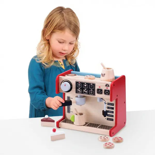 A two-sided compact and portable wooden coffee maker that simulates the total coffee shop experience. One side is the coffee maker with buttons and coffee and milk dispensers. On the other side is the store front displaying cookies and cake pieces. Improve imagination and ability to interact with others so to enhance social skills.