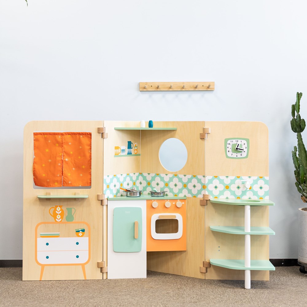 On one side, kids can pretend to prepare meals with a fridge, oven, sink, and stylish kitchen tools. Flip to the other side to take care of the laundry, jot notes on the magnetic chalkboard, or serve snacks through the adorable catering window—doubling as a puppet theatre! Thoughtfully crafted with a pop-up system, it’s easy to store and compact, while still delivering a full-size experience when open.