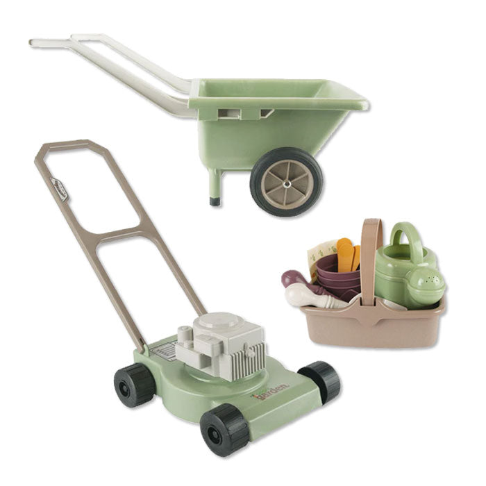 Wheelbarrow: A robust wheelbarrow with rubber-coated wheels for quiet play and optimal grip on grass, gravel, or pavement. Ergonomic handles support balance and coordination, and it’s designed to hold up to 50 kg.