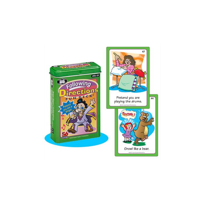 "Growl like a bear." "Pretend you are playing the drums." This Following Directions Fun Deck focuses on improving students' memory, motor skills, and processing of directions. Use the cards individually to present single step directions or combine them for multiple directions. The deck includes 52 different single step directions, four "connector" cards (and, or, before, and after), content cards, and game idea cards. Cards measure 2½" x 3½" and are stored in a sturdy storage tin.