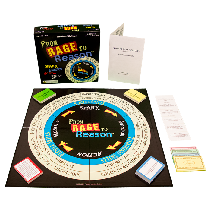 From Rage to Reason is a therapeutic and educational board game designed to teach important concepts and practical skills for controlling anger and avoiding violence. Players earn play money by giving Randy good advice on how to deal with frustrating and anger provoking situations throughout his day, both on the job and in his personal life. Randy is rejected by a friend, taken advantage of by a co-worker, and suffers through other anger provoking situations typical of older teenagers and young adults.