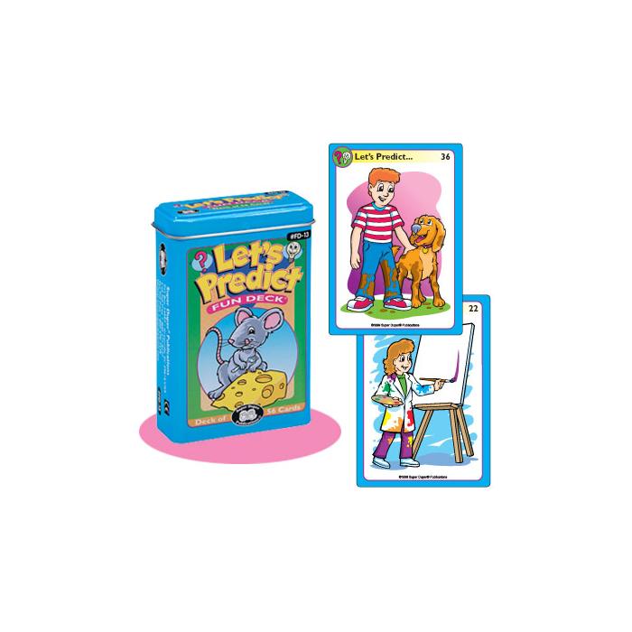 It's time to look into the future and talk about what will happen… after the little girl swings at the baseball… when the little boy digs a hole… once the elephant stands on the small stool. These are samples of the 56 different scenes you'll find in this enjoyable Let's Predict Fun Deck. The many language possibilities are endless because you receive 56 open-ended scenes! Cards measure 2½" x 3½" and are stored in a sturdy storage tin.