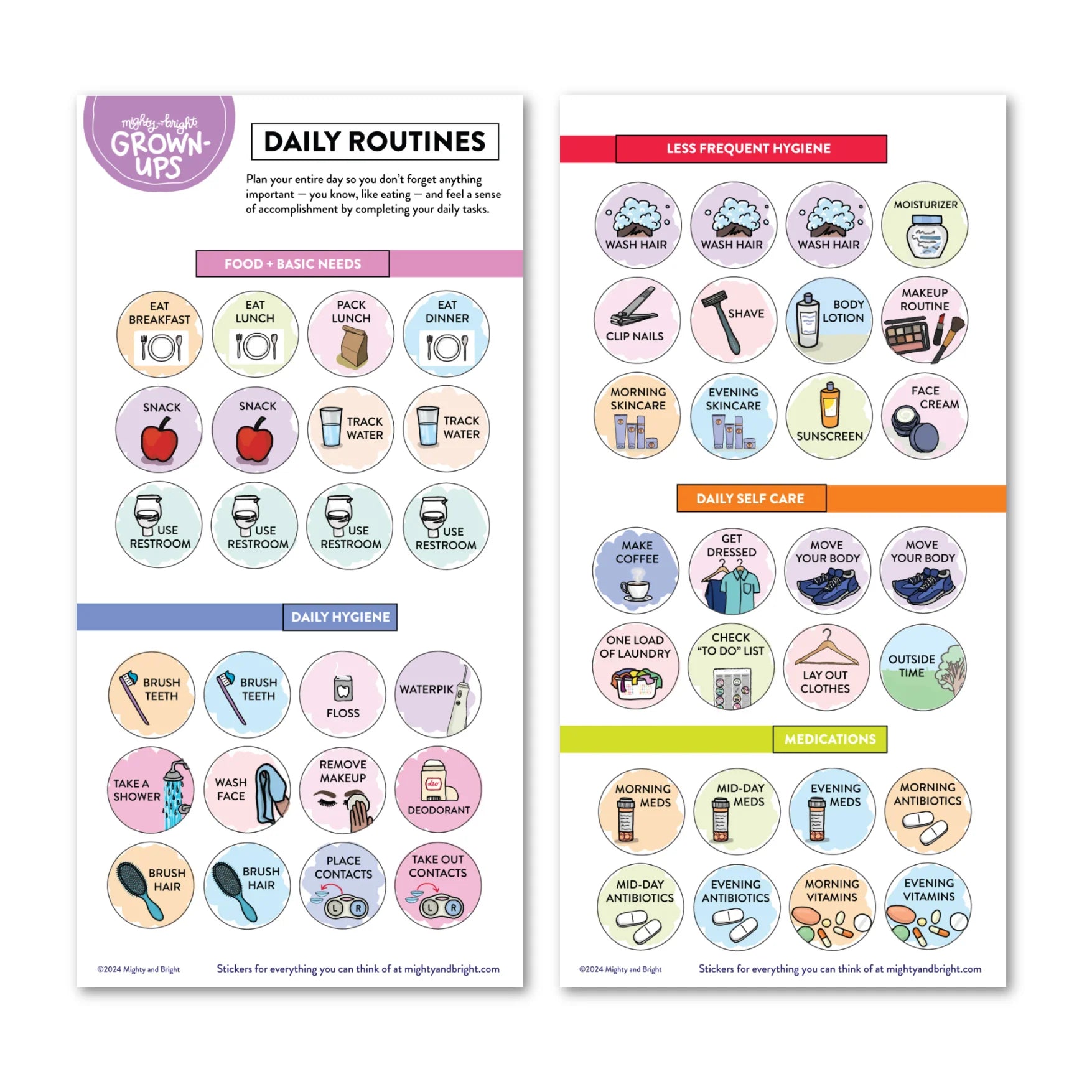 An extra sticker set to replace or add on to your calendar, to do chart or Stay on Task™ Bracelet. Also great if you prefer to use our reusable stickers on your own existing calendar. Please note these are reusable cling stickers and will only adhere to glossy surfaces like dry erase boards or windows.
