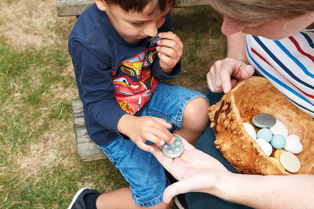 Offering an appealing range of shapes, textures and natural colours, the set includes twelve stones: two each of six designs (heart, egg, grooved, knobbly, two-tone and hollowed).