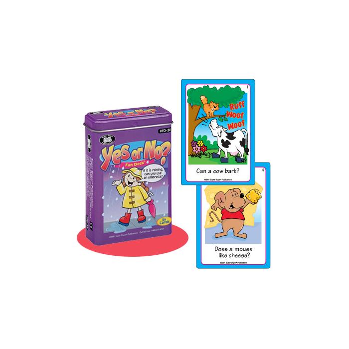 "Can a cow bark?" "Is a sock something to eat?" The Yes or No? Fun Deck focuses on mixed questions to improve each student's question, answering, and reasoning skills. Question forms include: can, do/does, if, and is. Includes 52 question cards and game ideas. Cards measure 2½" x 3½" and are stored in a sturdy storage tin.